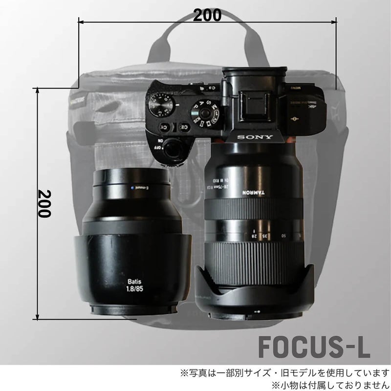 Lサイズ収納例 ボディ Sony α7R III 装着レンズ Tamron 28-75mm F/2.8 Di III RXD 交換レンズ Carl Zeiss Batis 1.8/85 フルサイズのミラーレスカメラと標準ズームレンズやコンパクトな単焦点レンズの収納が可能。 内寸:200X120X200mm