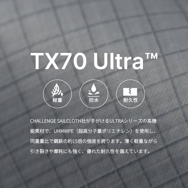 メイン素材に採用しているTX70 Ultra™は、CHALLENGE SAILCLOTH社が手がけるULTRAシリーズの高機能素材で、UHMWPE(超高分子量ポリエチレン)を使用し、同重量比で鋼鉄の約15倍の強度を誇ります。