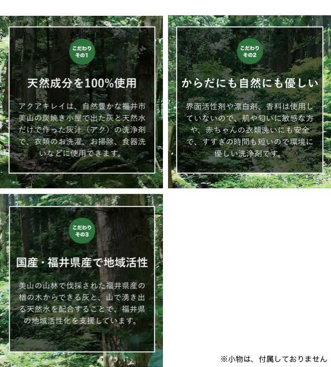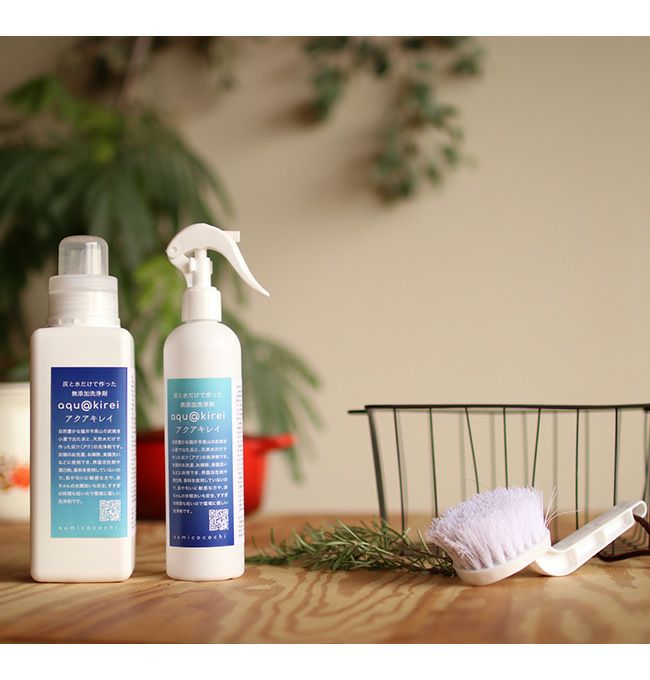 アクアキレイは、自然豊かな福井市美山の炭焼き小屋で生まれた灰と天然水だけで作った、アルカリ成分豊かな灰汁(アク)の洗浄剤です。