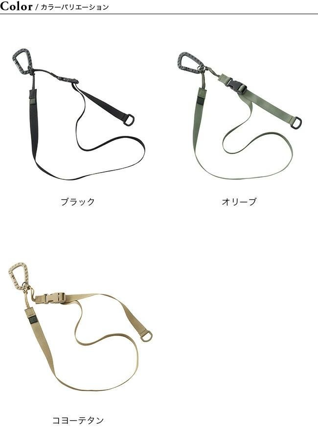 強化プラスチックのカラビナをつけたナイロンウェビングテープを使用したストラップです。
