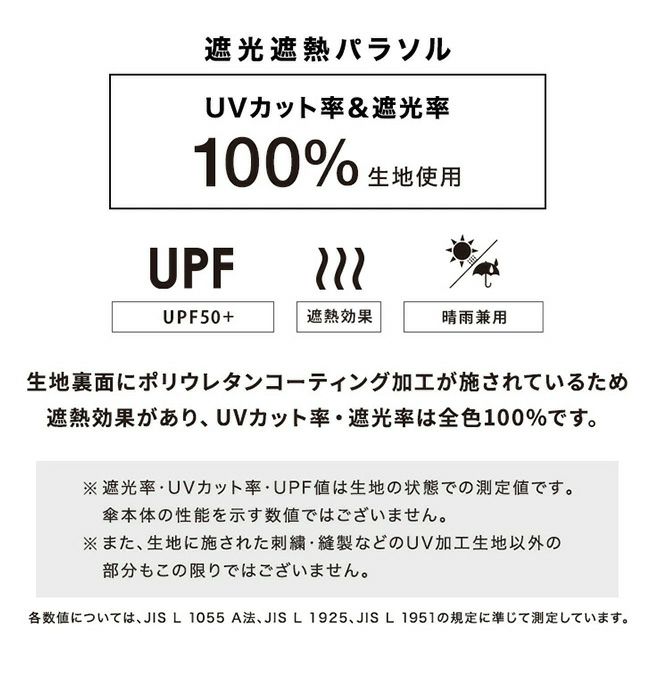 完全遮光・完全UVカット日傘全カラー遮光率・UVカット率ともに100%を実現し、日差しからお肌を守ります。
