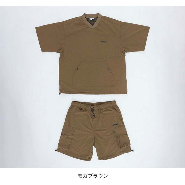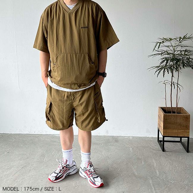 天候の変わりやすい夏のキャンプやフェスに活躍するナイロン製のセットアップ。