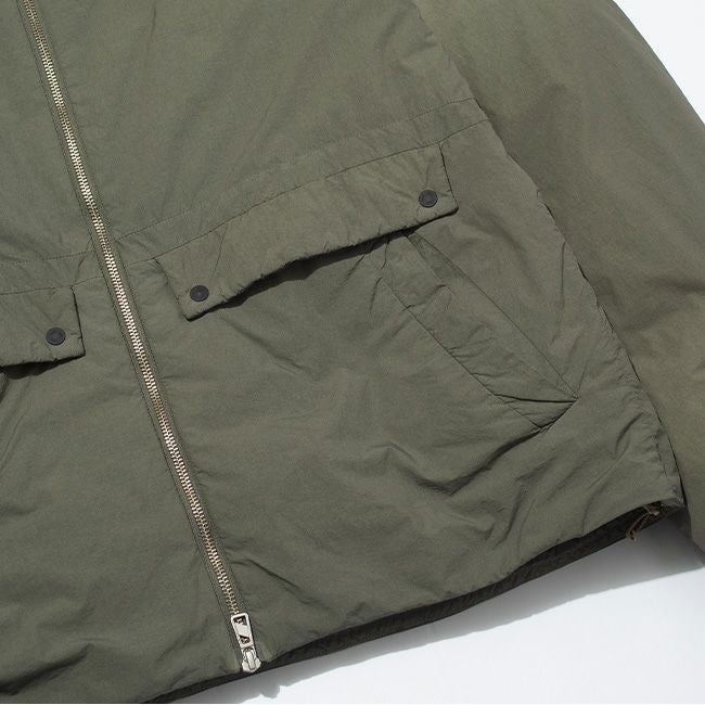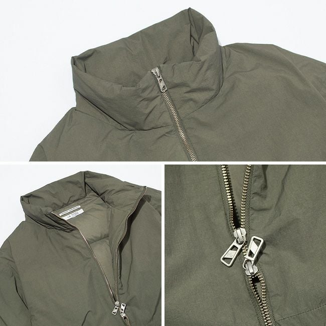 縦横の番手差を生かしたナイロン生地を使用し、製品染めを施したダウンジャケット。
