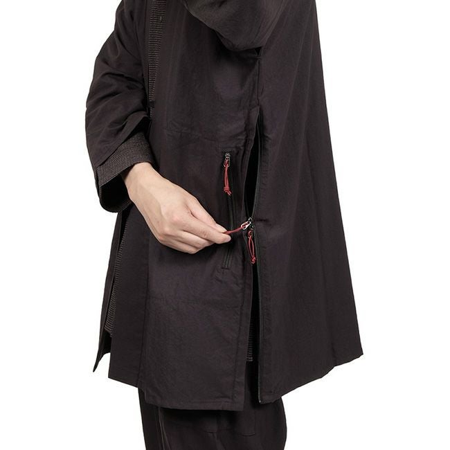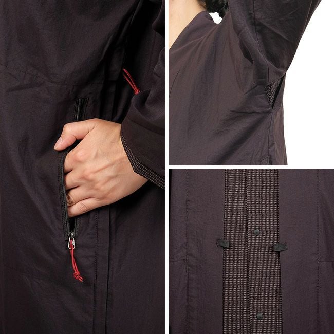 羽織った瞬間に身体に馴染む柔らかい素材にストレッチ性はありませんが、身頃も袖も太めのデザインなので動きやすく、シノギングにおけるストレスを感じることはありません。乳下がり(ちさがり)のループをS-BINNERで止めたり紐で結わいたりすることで、風が強い時のバタつきを抑えることができます。もともと風通しの良いデザインで、生地にも適度な通気性があるのでそれだけでも十分なのですが、脇の下を縫い開けてサイドジッパーを開けることで非常に優れた通気性が得られます。