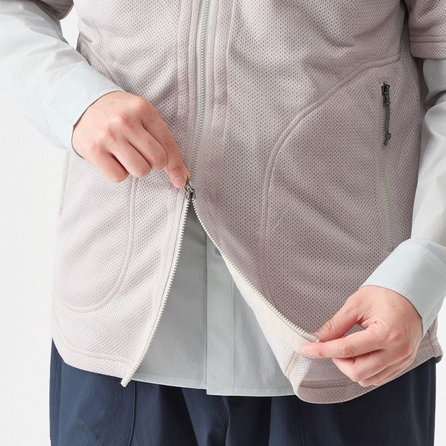薄手でありながらも必要十分な保温性を提供する帝人Octaを採用したこのカーディガンは、気まぐれな春の天気や休憩中の汗冷え防止にうってつけのインサレーションで、衿付きのシャツやTシャツに重ね着することを考慮して首まわりをすっきりラウンドネックで仕上げています。