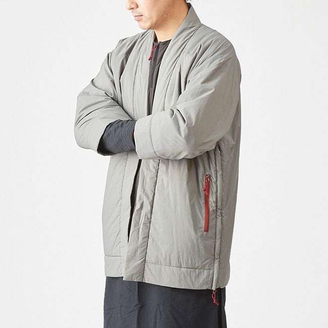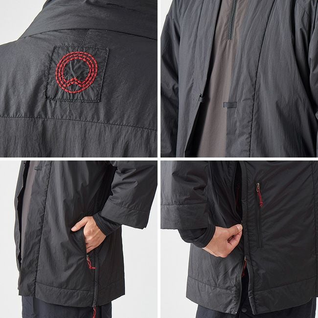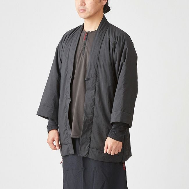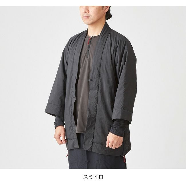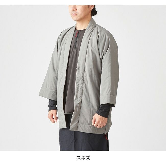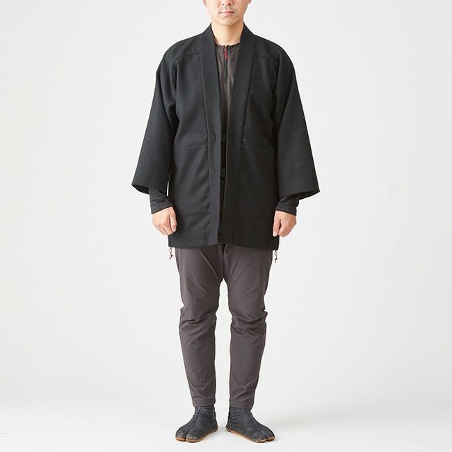 凌がデザインするアクティブインサレーションは、欧米の、いわゆる洋服のデザインではなく、古くから日本に伝わる意匠を基にしながらもシノギングに必要な機能を満たす素材を組み合わせ、シノギングに足るようにデザインを整えたハンテンです。