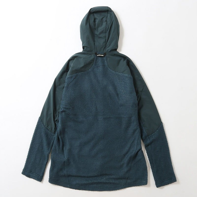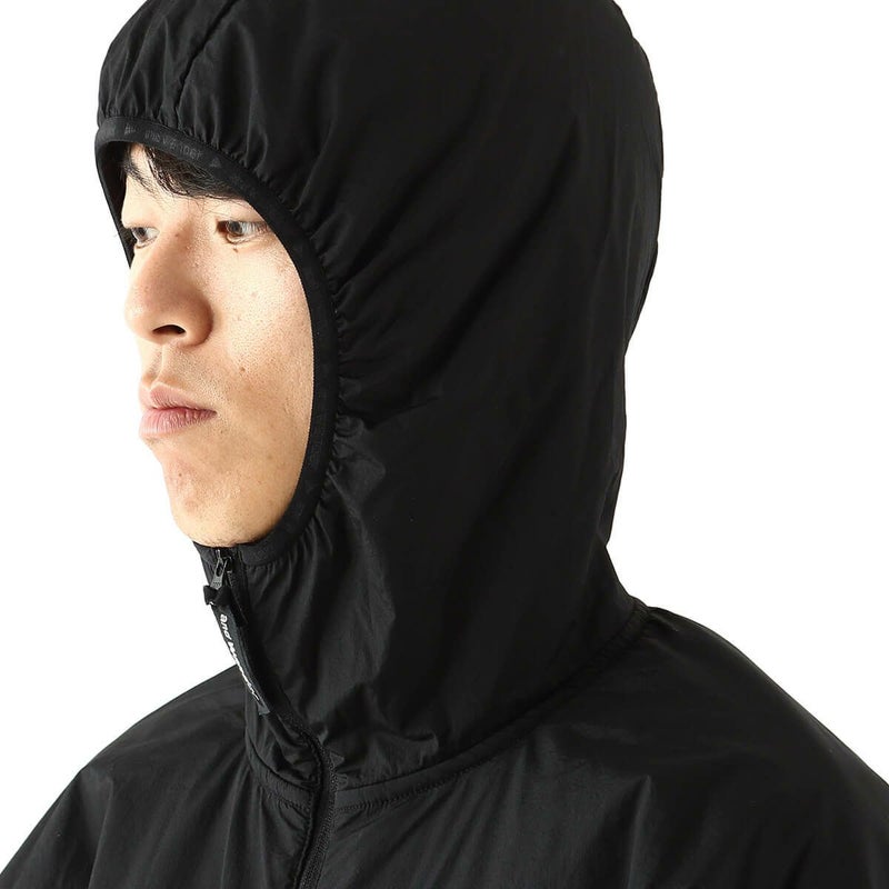 保温性は確保しながら、身体を動かすことによって発生する熱や汗をスムーズに放出するこのウェアは、風の当たりやすい前身頃やフードに、ナイロン生地を用いています。