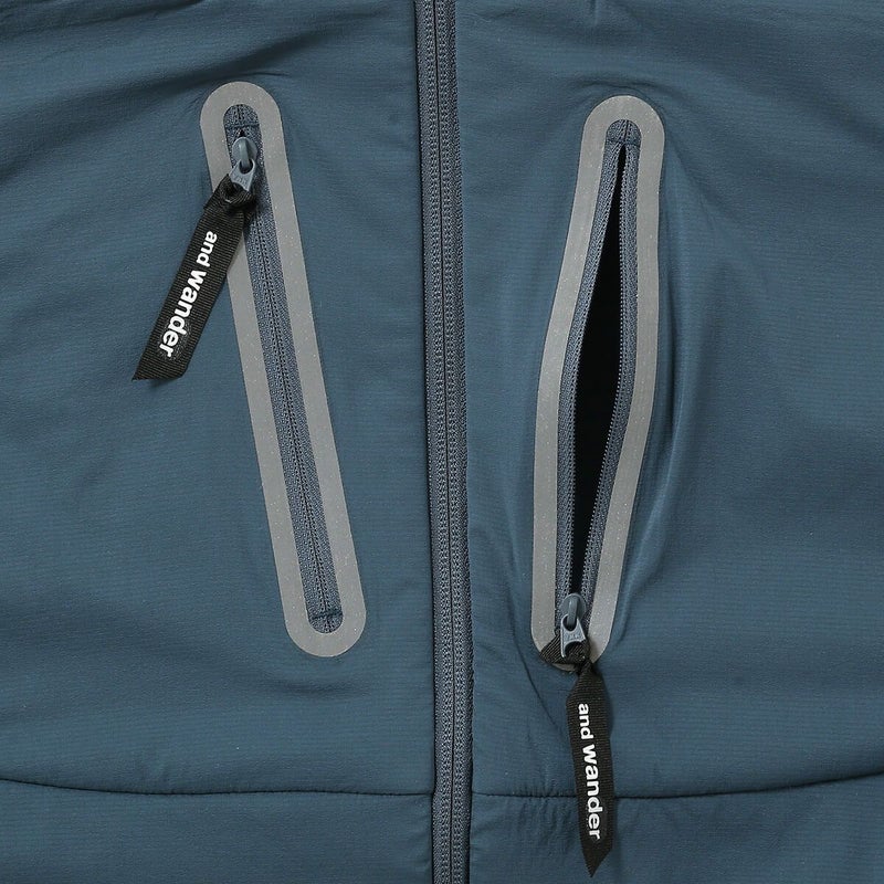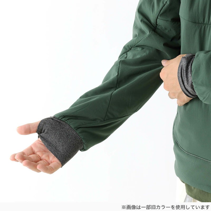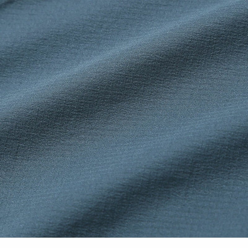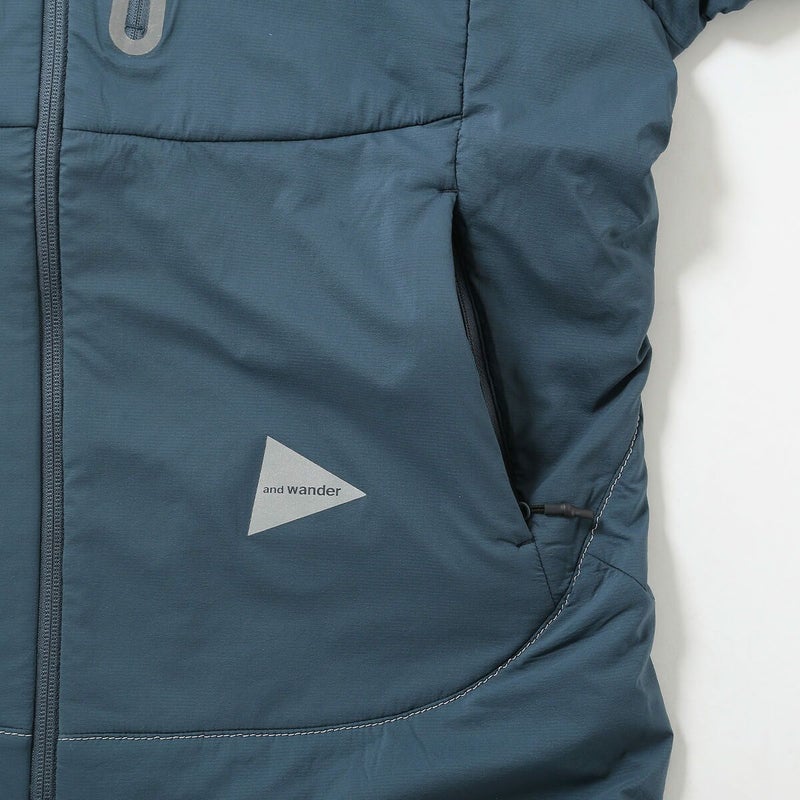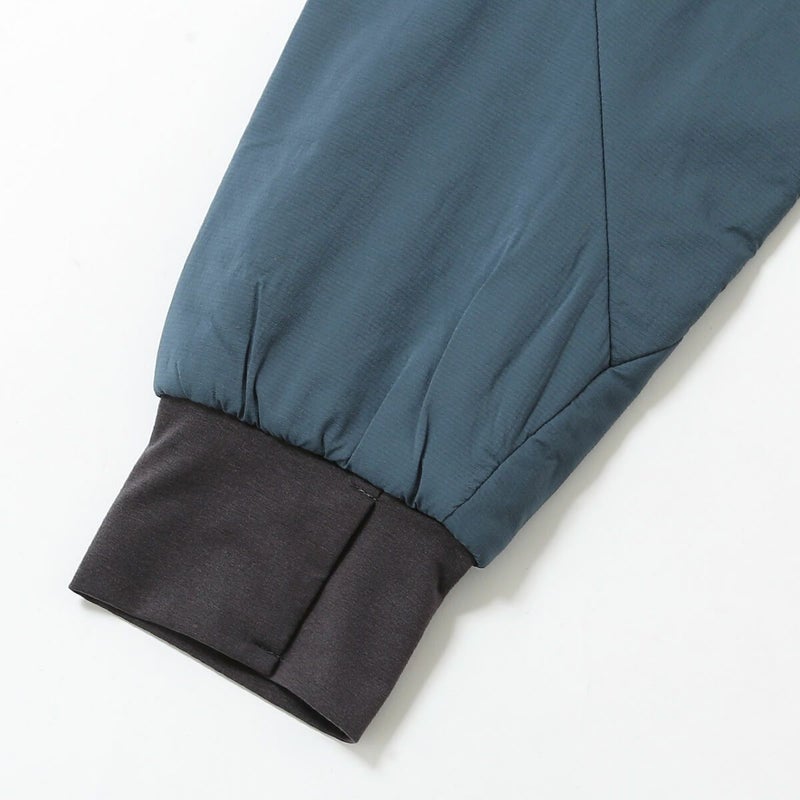 中綿を包む表地は30cm3/cm²・s、裏地は65cm3/cm²・s(フラジール形法ASTM D 737)の通気度の高い耐久撥水生地を使用しており、保温性は確保しながら、身体を動かすことによって発生する熱や汗をスムーズに放出します。
