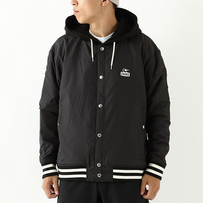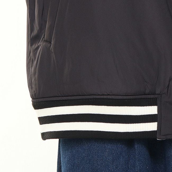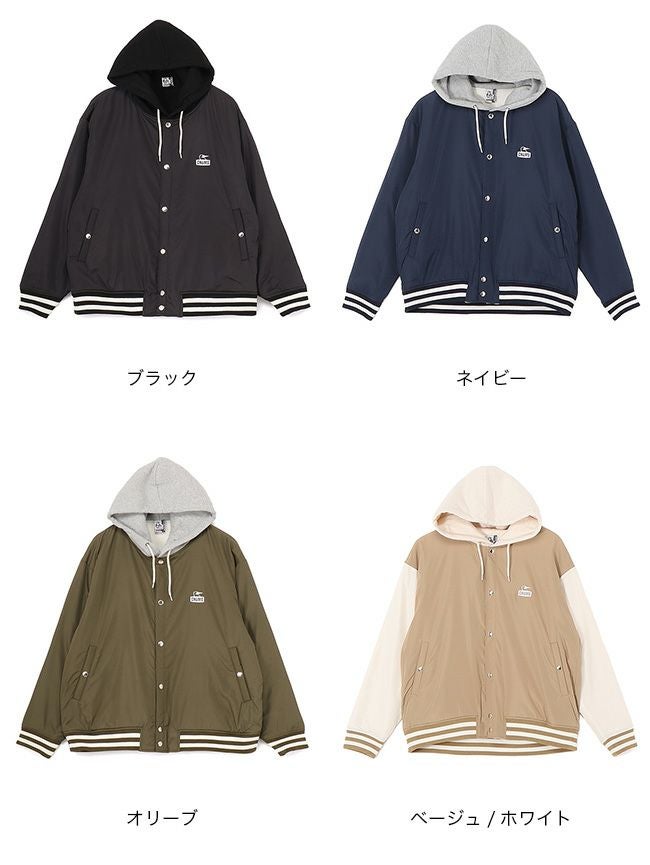 スタジャンとパーカーの重ね着風デザインで、着こなしテクいらずでコーディネートが完成します。