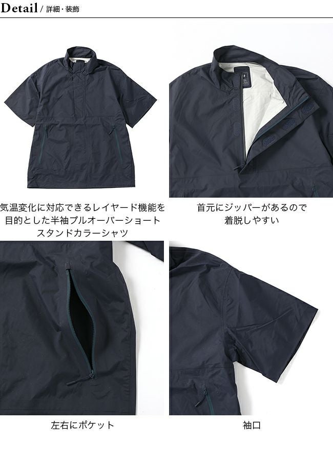 気温変化に対応できるレイヤード機能を目的とした半袖プルオーバーショートスタンドカラーシャツです。