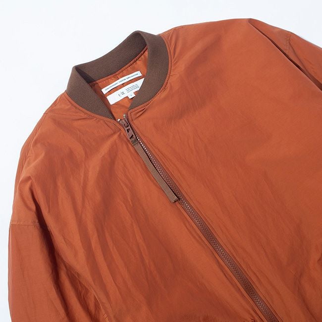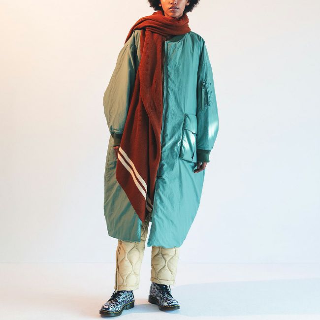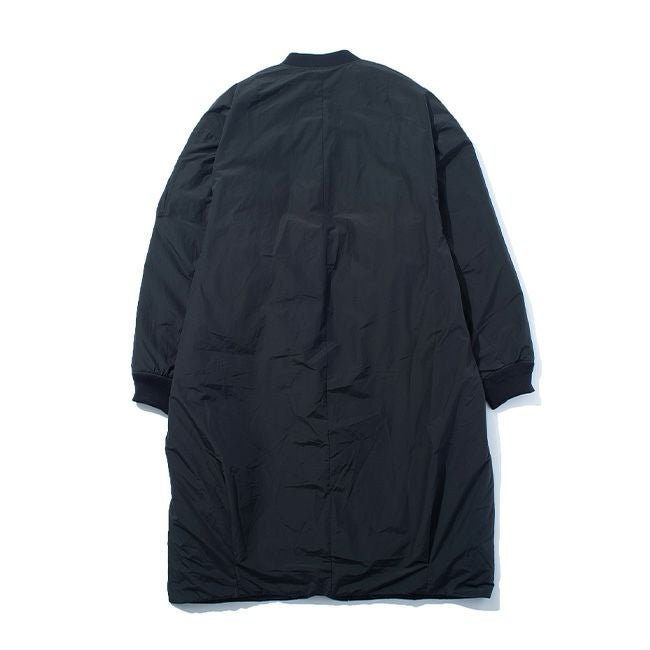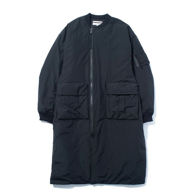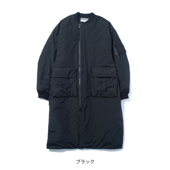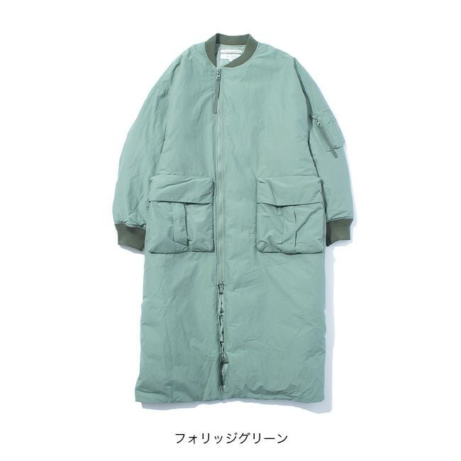 ジャケットや寝袋・布団から羽毛を回収し、丁寧に再洗浄された650フィルパワーのダウン、素材はリサイクルナイロンを使用した、MA-1タイプのロングコート。