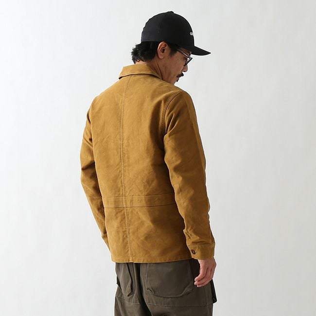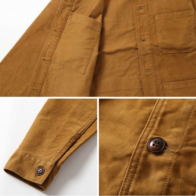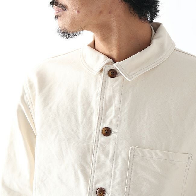 1950年代のフランスのワークジャケットをベースに身頃を3枚構成(前身頃、脇身頃、後身頃)にすることで、身体に沿ったシルエットラインを形成。