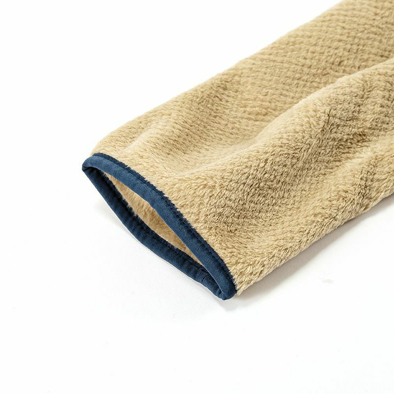 襟と袖口と裾を伸縮性のある肌触りの良い縁取りで補強し、保温性と機能的なフィットを提供
