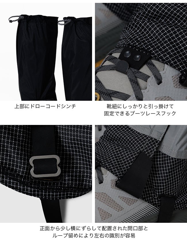 ・靴紐にしっかりと引っ掛けて固定できるブーツレースフックを備え、足元を確実に保護