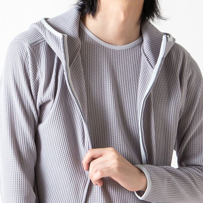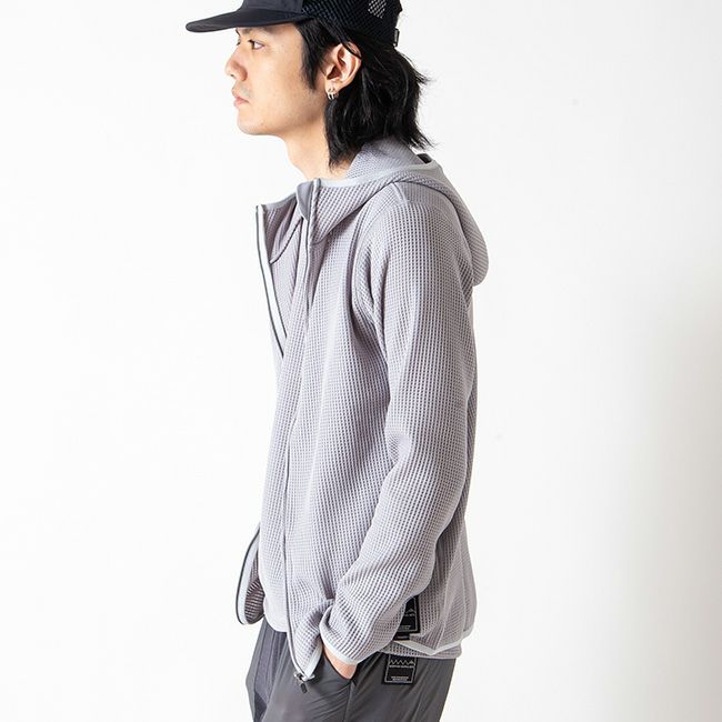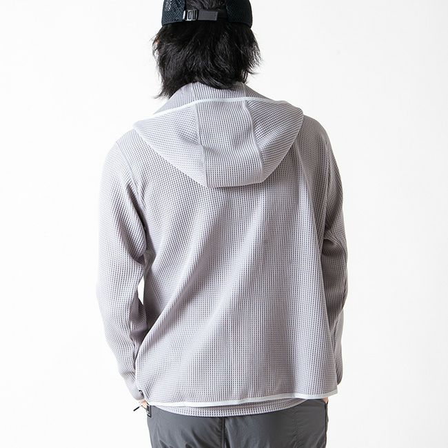 中肉厚ながら通気性の高い粗いメッシュが特徴的な「POLARTEC® Power Dry」ネットメッシュを使用したフルジップフーディー。