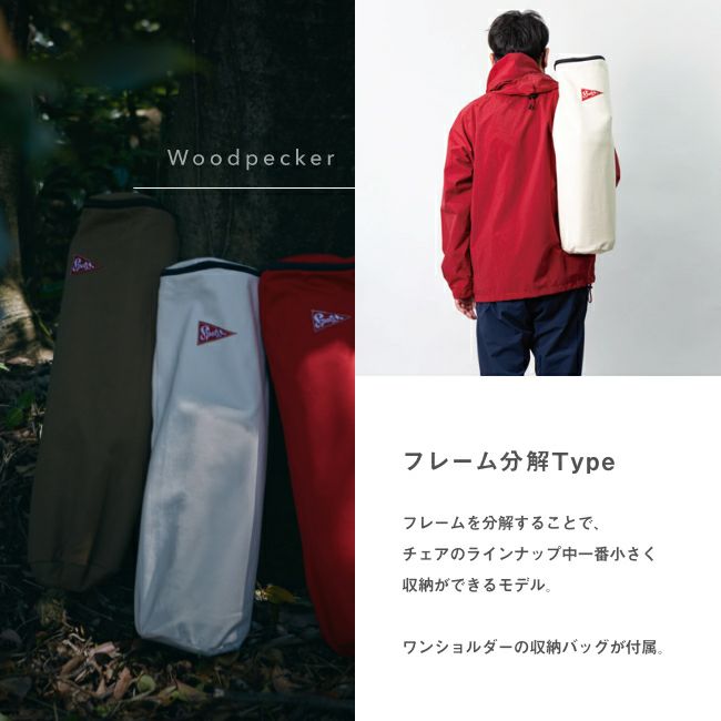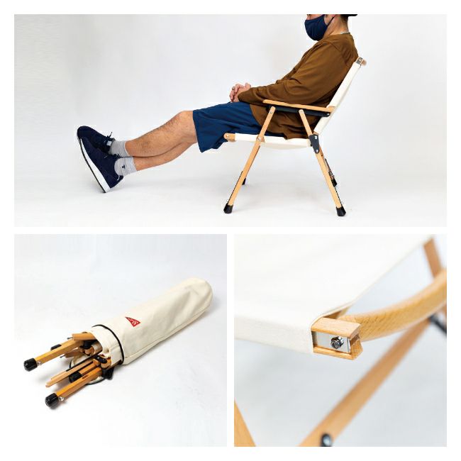 シート高は低めに設定、シートの傾斜はフラットに近いため自然な姿勢でのシッティングで、ロースタイルの食事や焚き火などに最適!フレームを分解することでラインナップ中一番小さく収納できるモデルです。