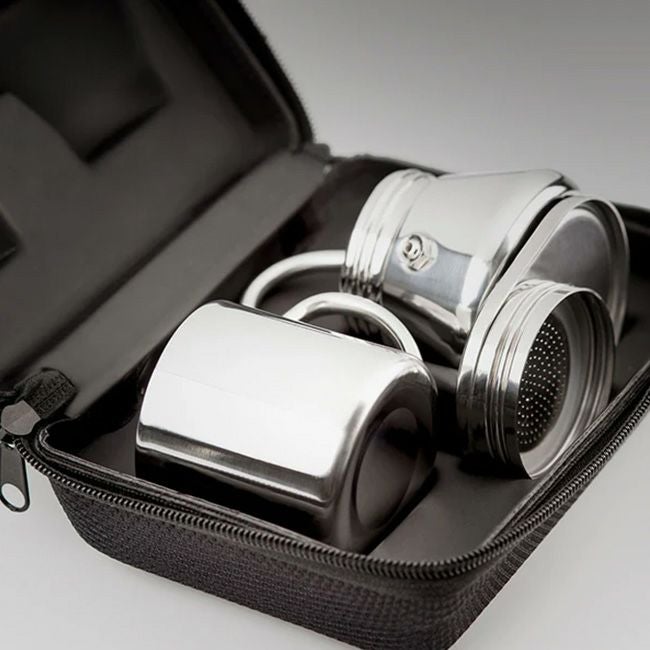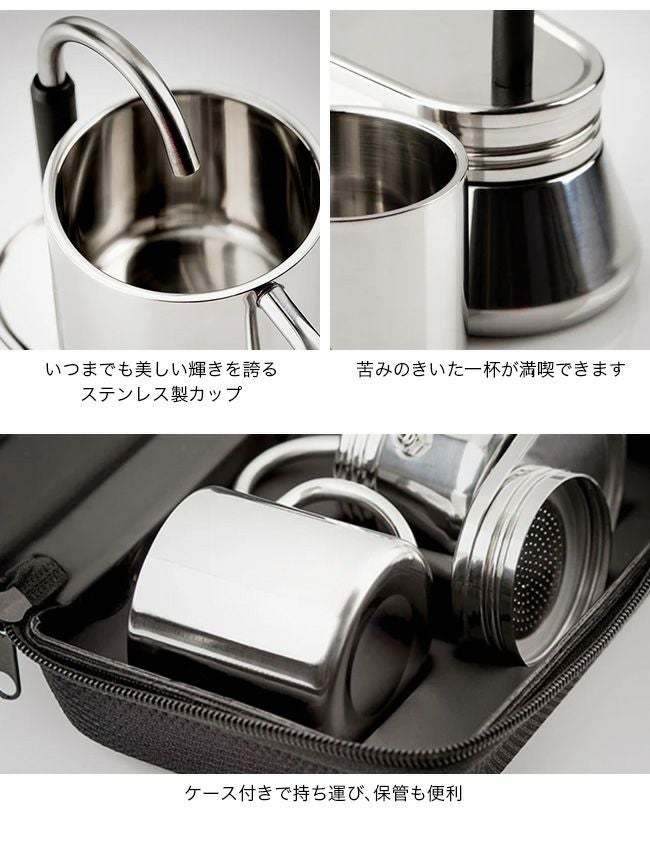 家庭やキャンプで気軽に、エスプレッソ、カプチーノコーヒーが作れるコーヒーメーカーと保温保冷が可能なダブルウォールマグカップのセットです。