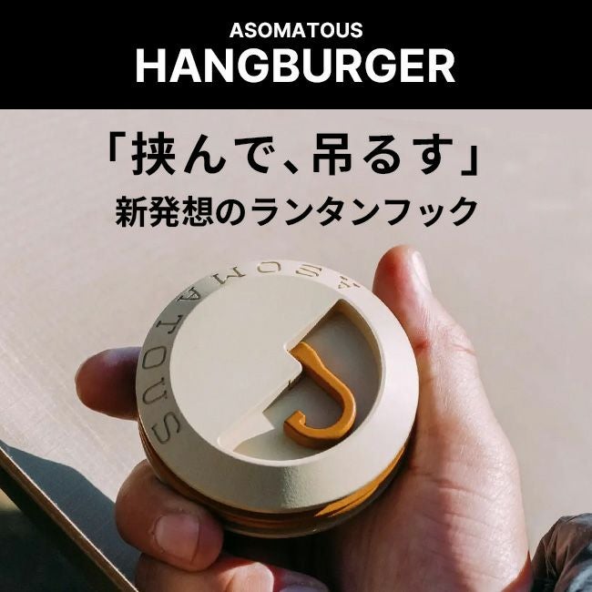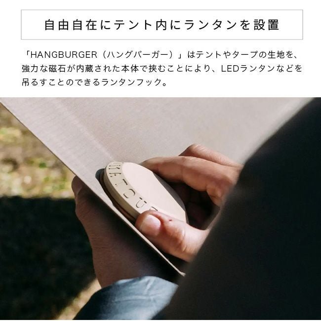 HANGBURGER(ハングバーガー)は、テントやタープの天井にLEDランタン等を設置することのできる、「挟んで、吊るす」新発想のランタンフックです。