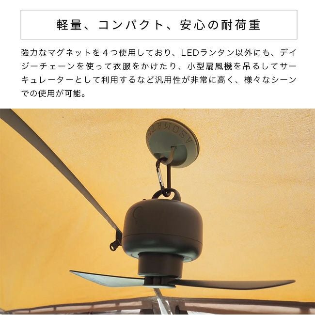 そのためLEDランタン以外にも、デイジーチェーンを使って衣服をかけたり、小型扇風機を吊るしてサーキュレーターとして利用するなど汎用性が非常に高く、さまざまなシーンでの使用が可能です。
