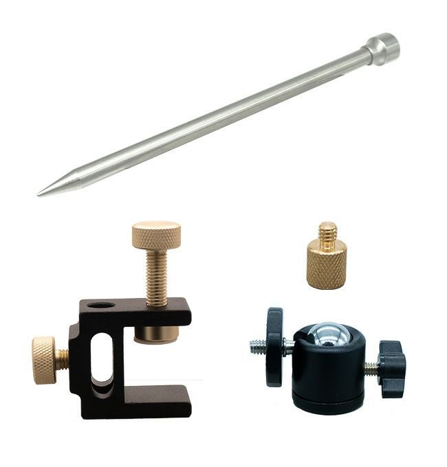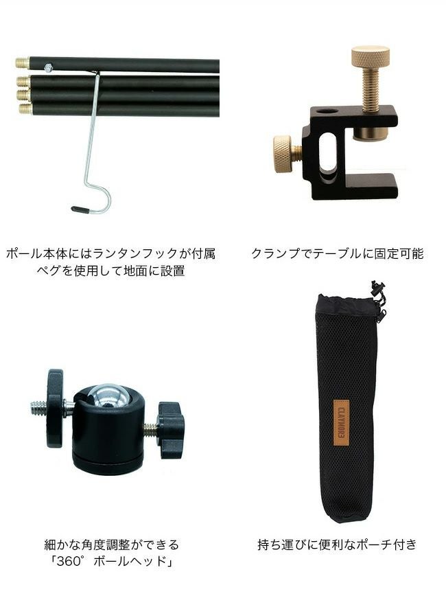 ■構成品:メインポール1本・サブポール3本・マウントアダプター(1/4インチネジ) ・360°ボールヘッド・スタンドクランプ・固定用ペグ・ポーチ