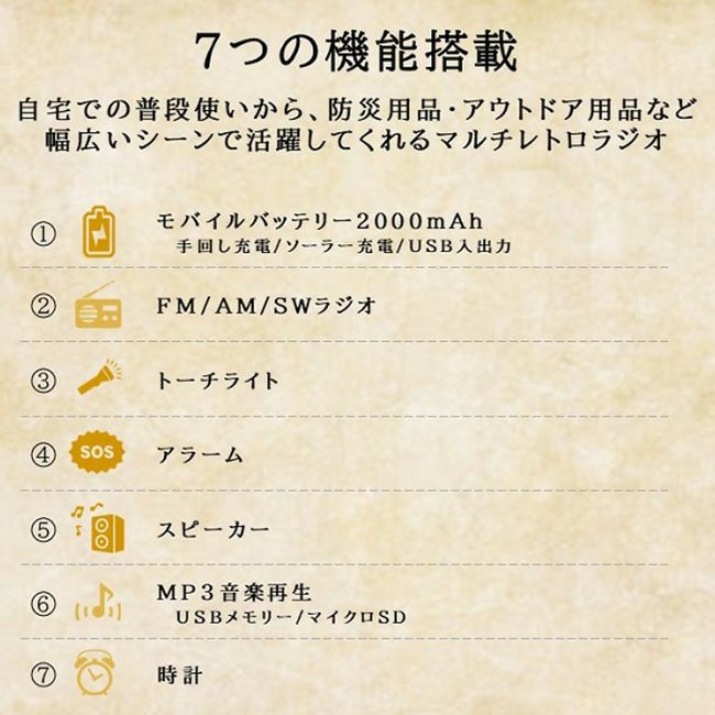 ■機能:FM/AM/SW ラジオ、緊急アラーム、Bluetoothスピーカー、MP3プレイヤー、AUX 接続、モバイルバッテリー、懐中電灯(LED)、時計、目覚まし