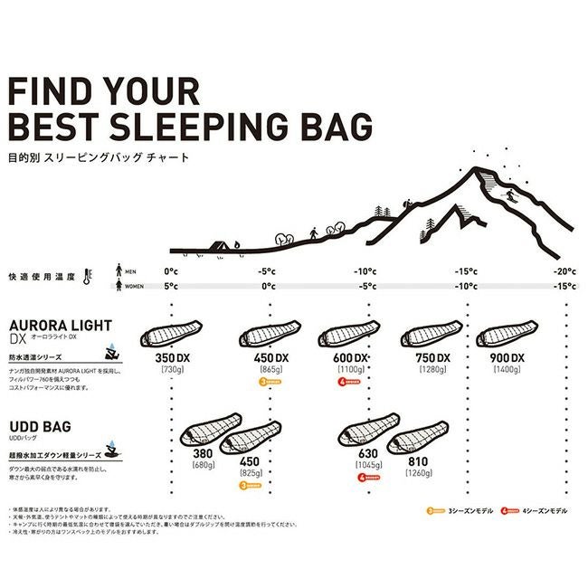 NANGAが独自に開発した防水透湿素材AURORALIGHTを採用したスリーピングバッグシリーズ。