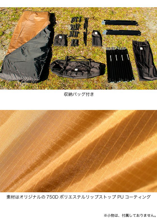 素材はオリジナルの750Dポリエステルリップストップ PUコーティング表側にはDWR撥水、裏側には難燃加工を施しているので、キャンプシーンには申し分ないかと思います。