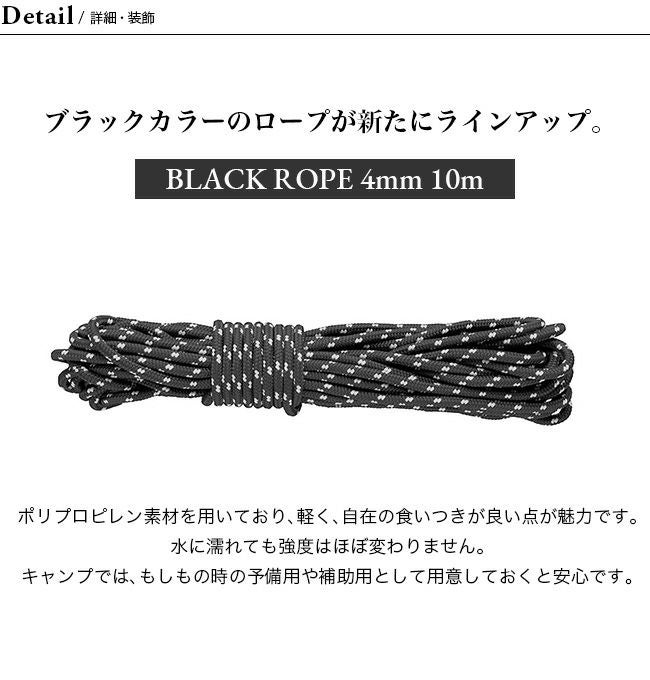 Pro. air シリーズなどの幕体にも使用している、タープなどに最適な直径4mmのブラックカラーのロープ。