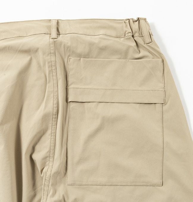 タック入りのワイドテーパードシルエットで動きやすく、たっぷり収納できるフラップ付きポケットがついています。