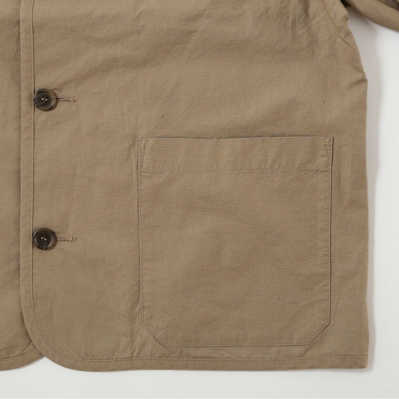 大きめのマチ付き腰ポケットと太い折り返しの袖口が特徴のカラーレスジャケットです。