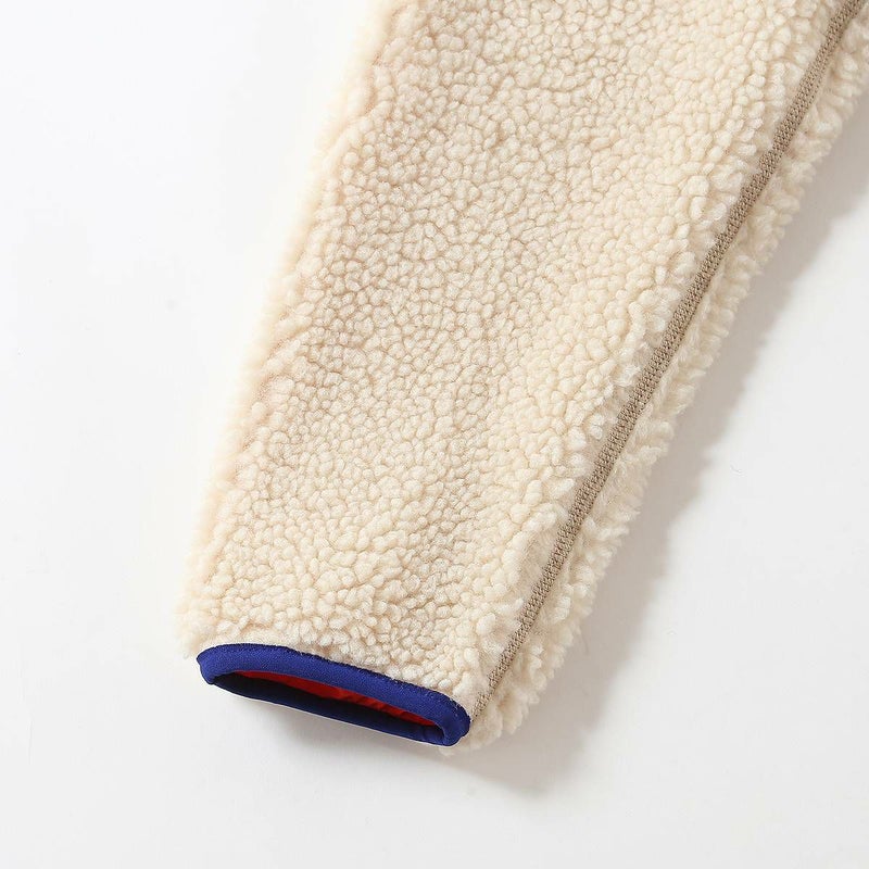 ソフトなリサイクル・ポリエステル100%の6ミリ厚パイル・フリースを使用した、防風性と保温性を提供するキッズ用のレトロX・ジャケットは、リサイクル・ポリエステル100%のタフタの裏地付き。