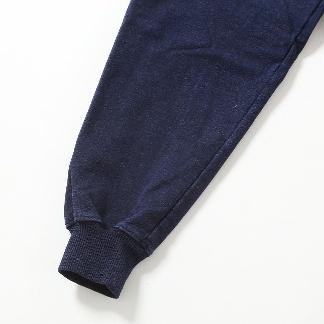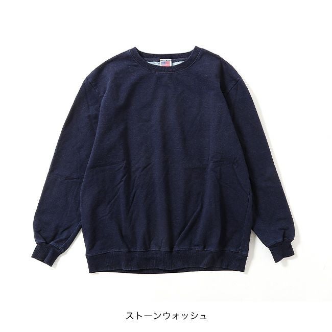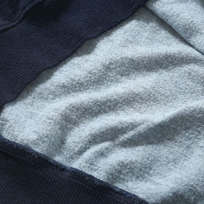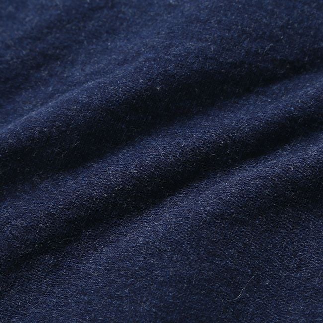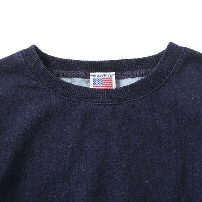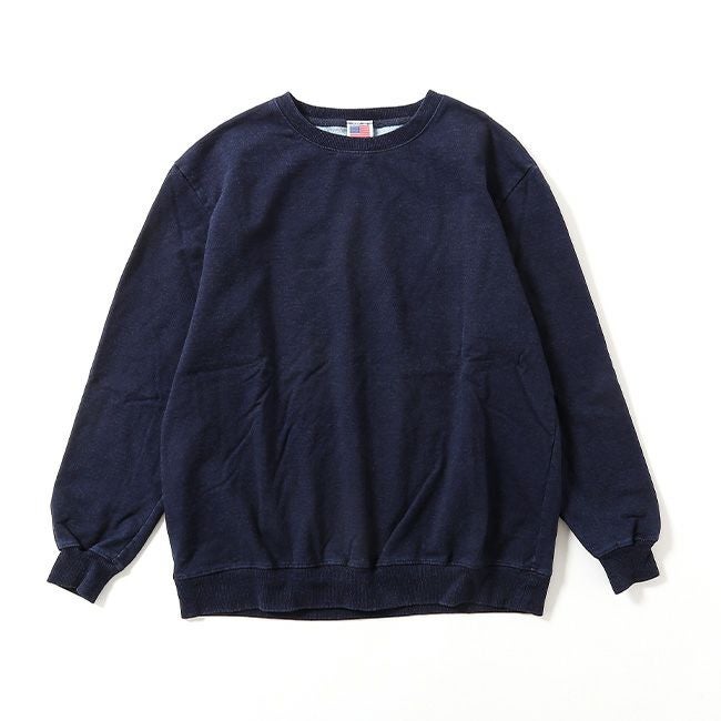 アメリカ製のインディゴ染めクルースウェットは、程良い厚みで、着用を重ねることで経年変化が楽しめる一枚です。