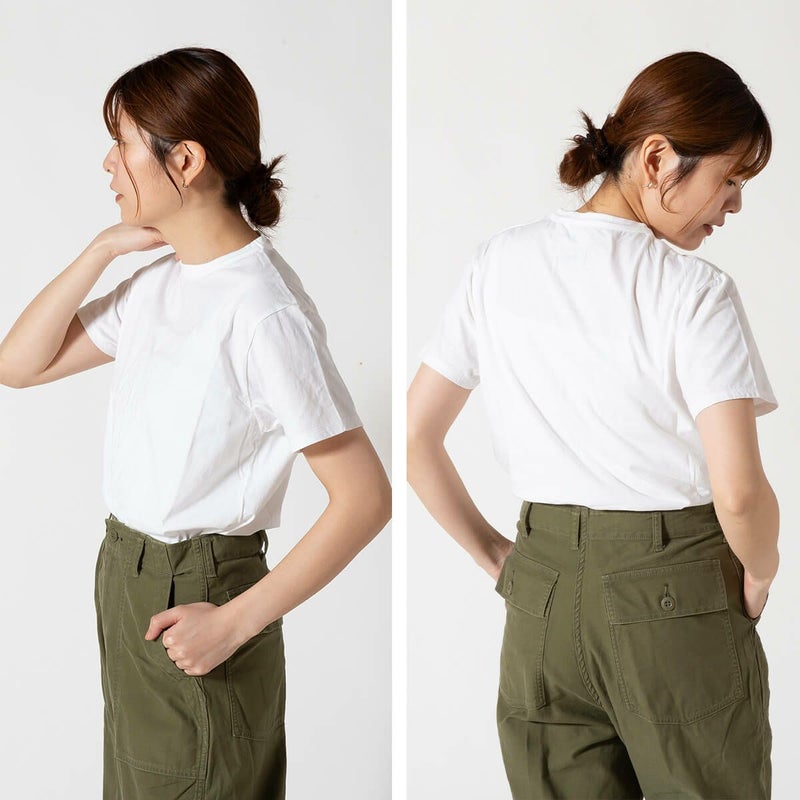ニットやスウェットとレイヤードした際、首元からキレイにネック部がのぞくよう、サイズとシルエットにこだわって作ったシンプルなTシャツです。