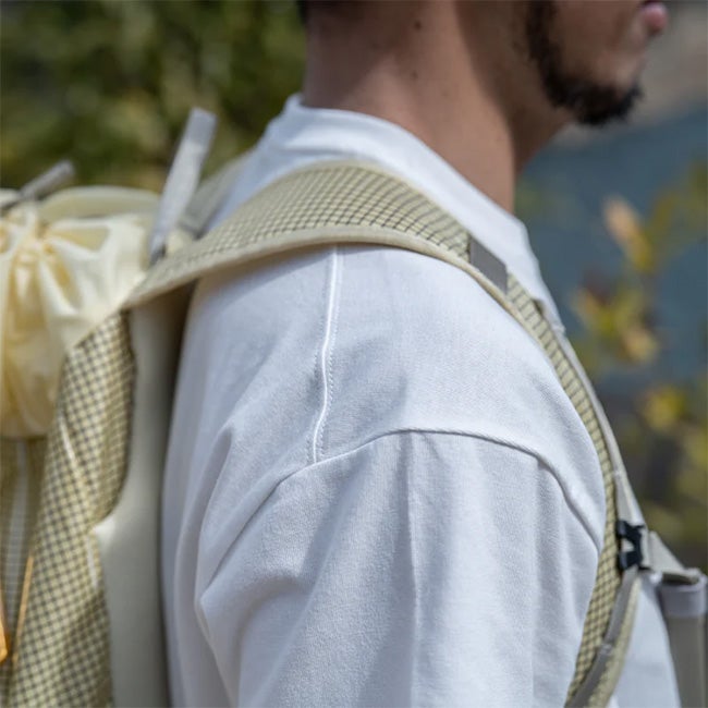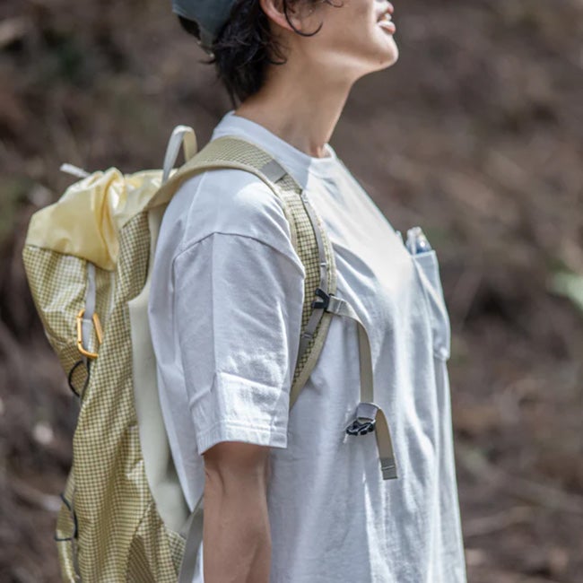 首元は一般的なTシャツより若干タイトで伸びにくく、ポケットはサングラスが落ちにくい仕様(意匠登録済)、バックパックとの干渉を避ける肩のステッチ、換気を高めるサイドスリットなど細部に拘りました。