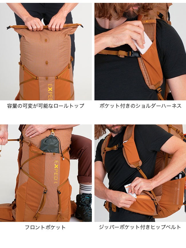 広々としたメッシュの外ポケット、ヒップベルトのジッパー付きポケット、モジュラー式のアタッチメントポイントにより、装備の整理整頓もスムーズです。
