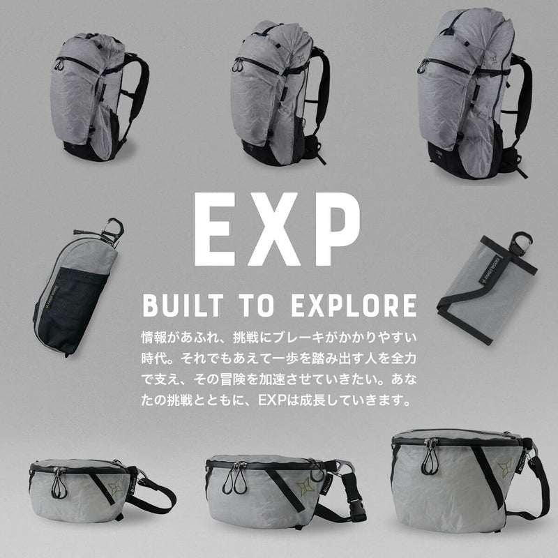 EXPは「BUILT TO EXPLORE」をコンセプトとしたフラッグシップシリーズです。過酷な環境でも安心して使えるように、素材や仕様を徹底的にこだわりました。TRAIL BANK EXPはメイン素材にALUULA Graflyte®を採用し、過酷な環境でも安心して使える仕様に仕上げました。