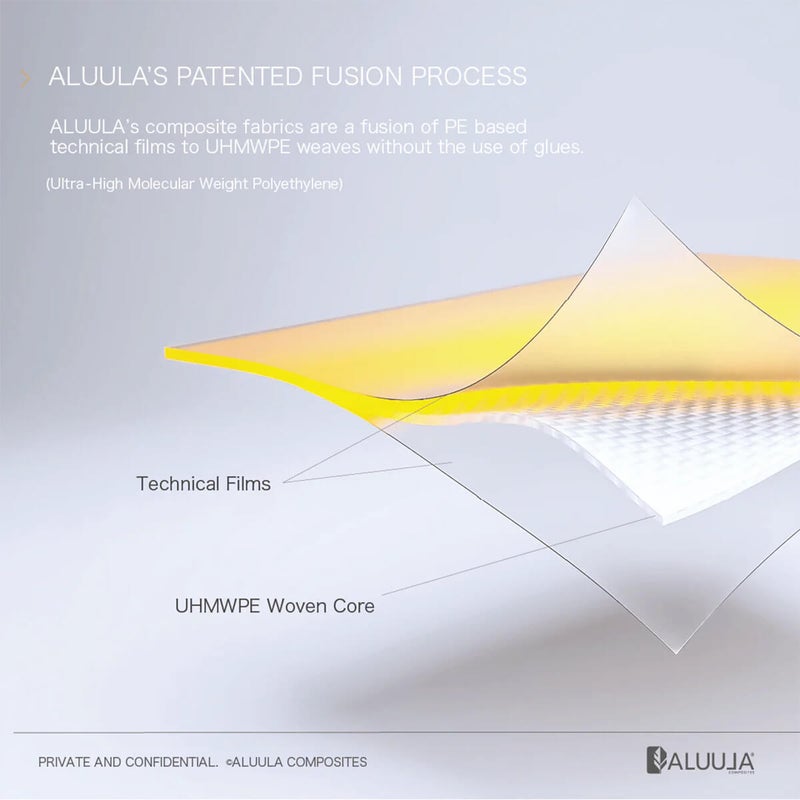 カナダのALUULA社が開発した新素材。PE ベースのテクニカルフィルムとUHMW-PE(超高分子量ポリエチレン)の織物を、接着剤なしで融合させるプロセスが大きな特徴です。超軽量で優れた強度、並外れた引き裂き抵抗、極度の耐摩耗性、UV 抵抗性、水・ガス不透過性を併せ持つハイパフォーマンスな生地なので、タフな冒険にも最適です。