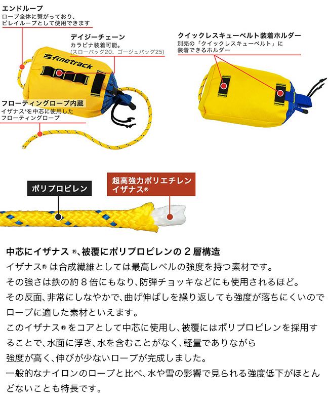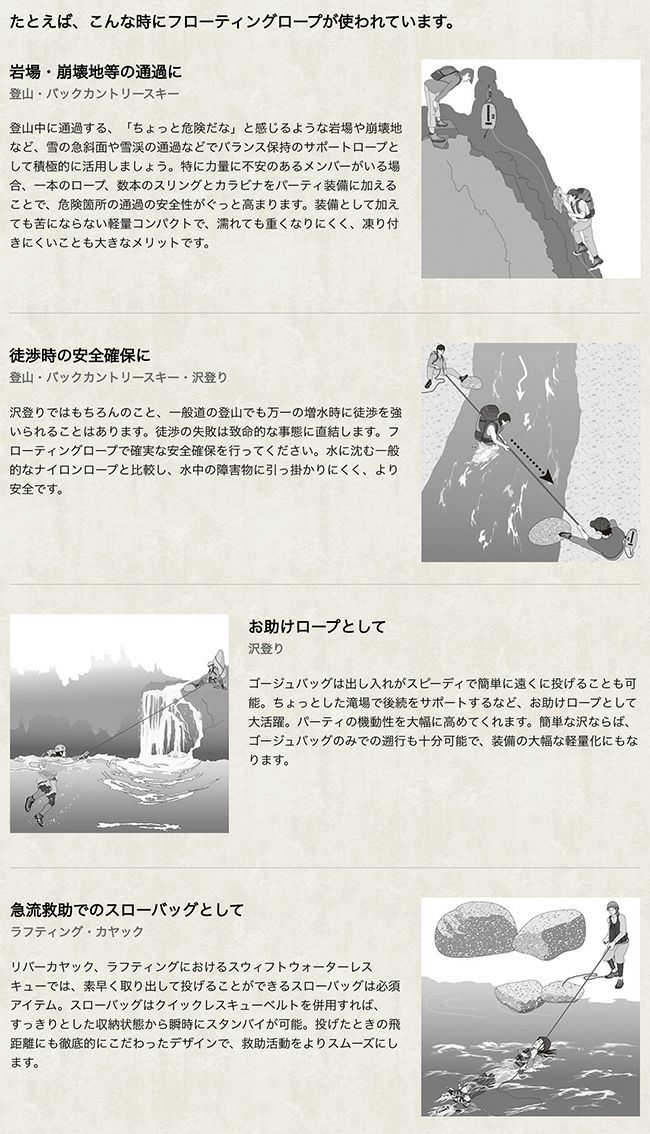 また、携行性の高さから登山・BCスキーのサポートロープとしても積極的にお使いいただけます。