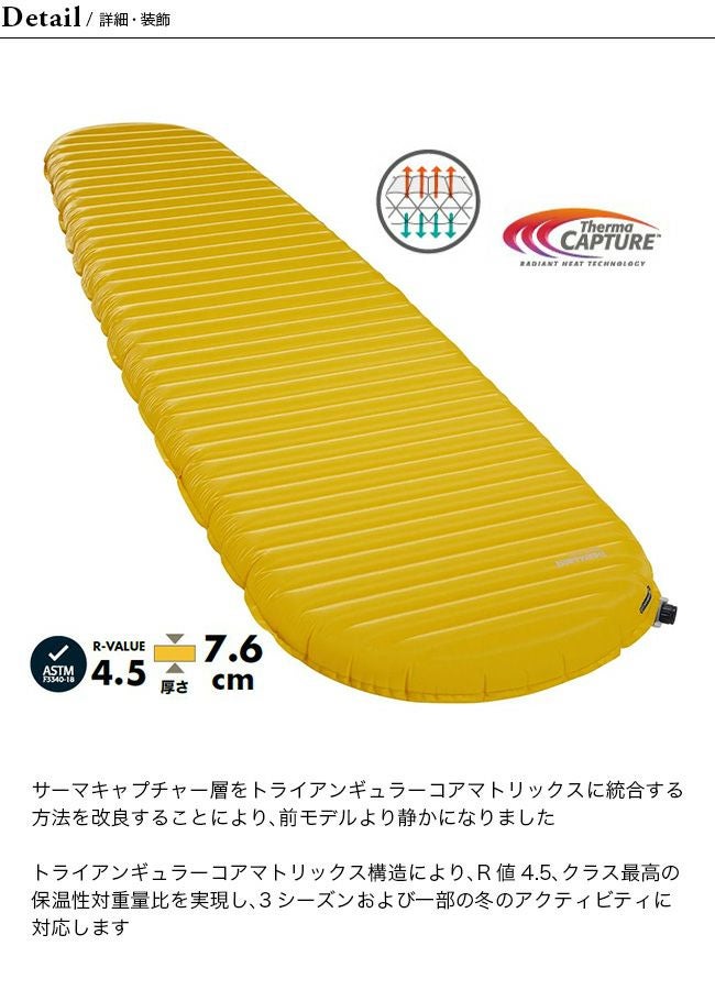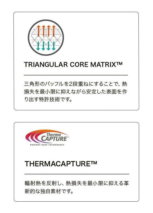 保温性:トライアンギュラーコアマトリックス構造により、R値4.5、クラス最高の保温性対重量比を実現し、3シーズンおよび一部の冬のアクティビティに対応します。