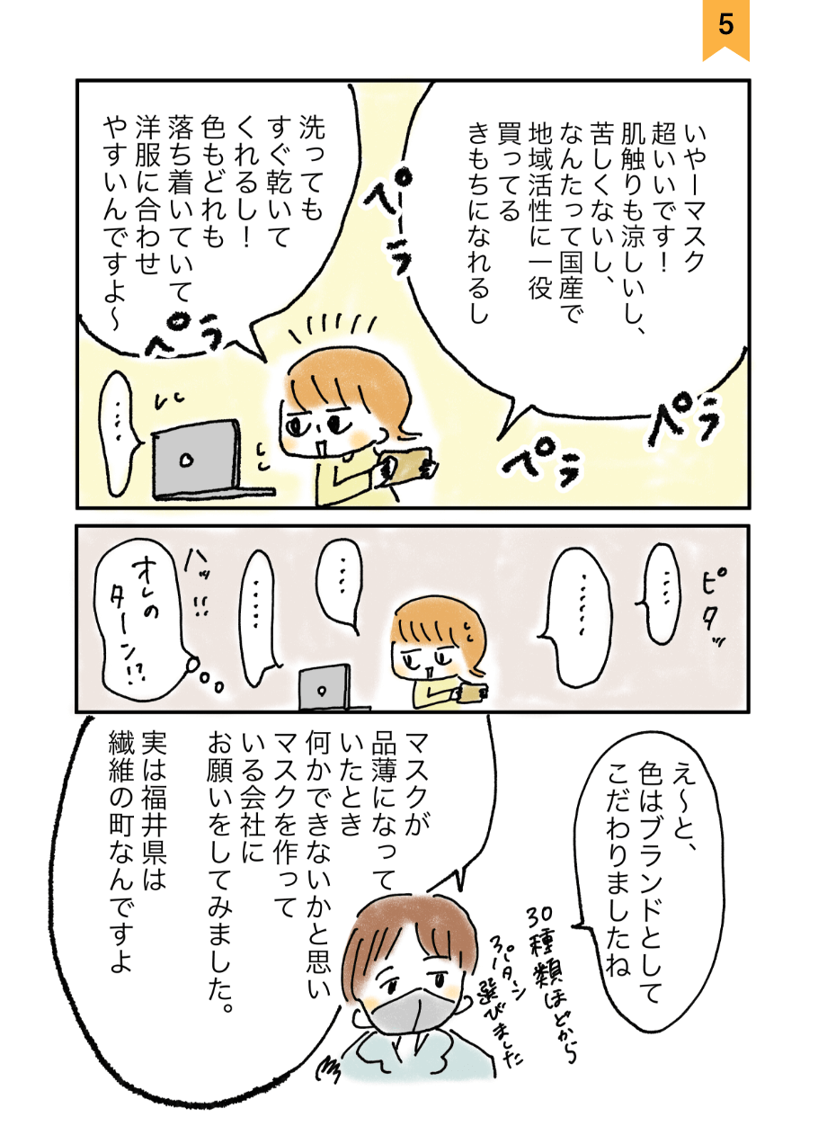 マスクを使われているこいしさんから生の声が聞けて、知られていない魅力も伝えることができました。マスク以外のアイテムも伝えきれないほど、細部にまでこだわりを持って開発してます。納得いくまで色だしして試作を繰り返す毎日です・・・