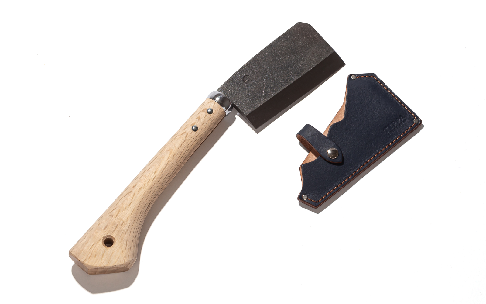 一方、鉈(なた)は刃の部分が重たいから手斧ほどの力はいらない。なので薪を割るとき、ぼくは鉈を使うことがほとんど。刃物類はひと通り持っていますが、もし、自分が刃物を一本しか持っていけないとしたら、〈テッパ〉の鉈を選びます。柄が長く持ちやすいし、この大きさでもフェザースティックが簡単に作れる。ペグ打ちにも活用しています。