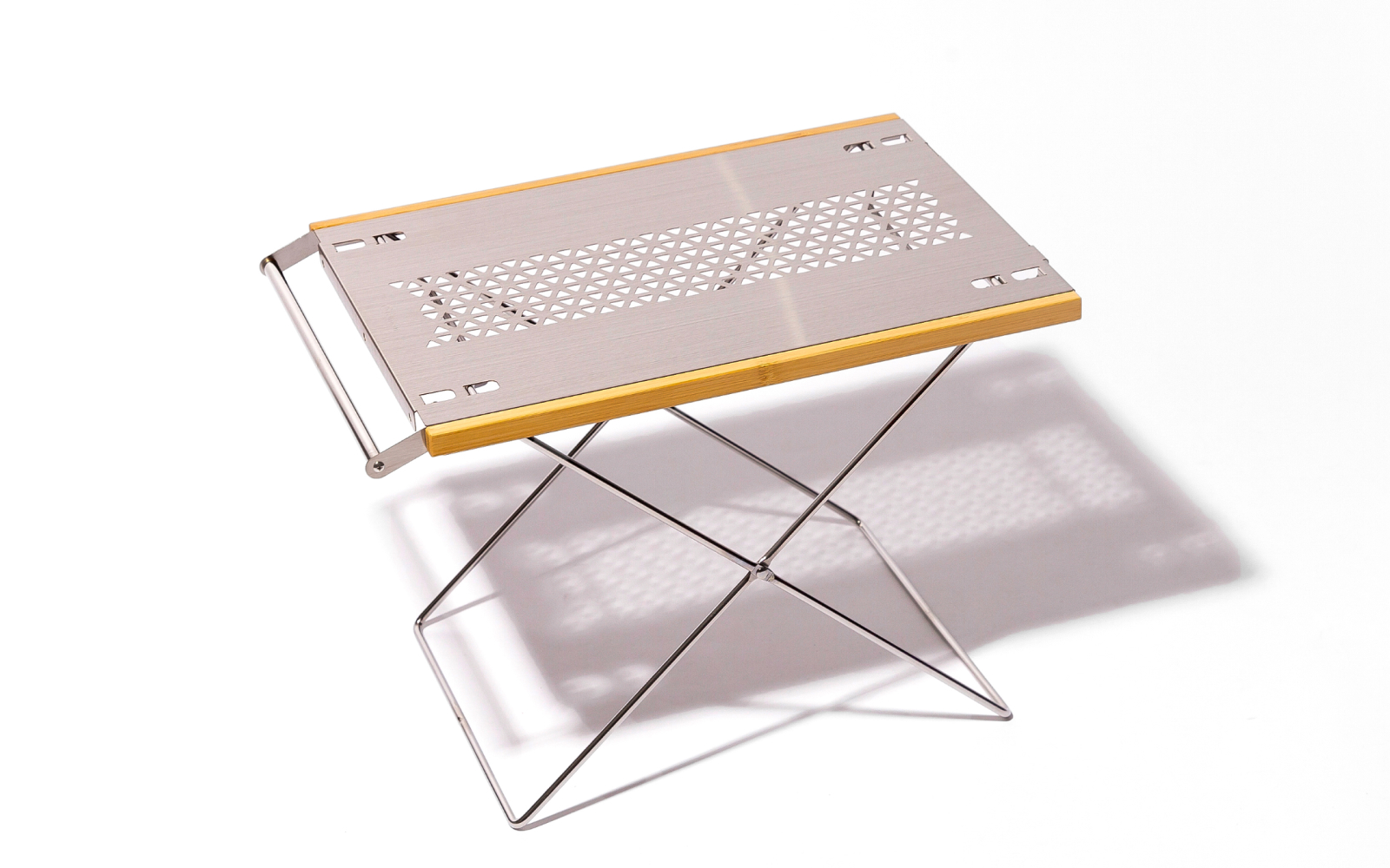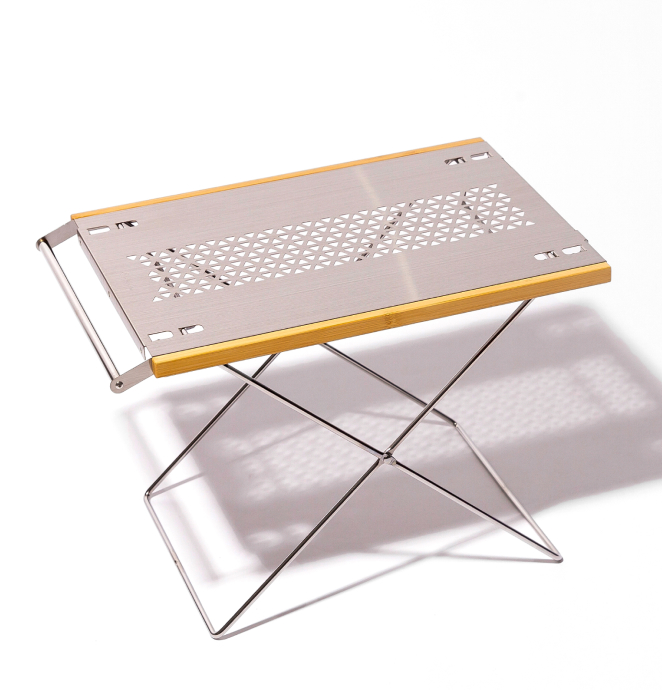 〈ベルモント〉はグッドギアが多いですが、なかでも最近のお気に入りがこのテーブル。組み立てが本当に簡単で、クルマから取り出したらサッと設置できるから撮影現場でも重宝しています。天板はステンレスなので、火の粉もまったく気にならないし、熱いダッチオーブンもそのまま置ける。耐荷重も10kgでどっしりしているので、なにも気を使わず、どんどん置けます。高さが2段階調整できる点も重要で、どんなチェアとも相性がいいから、その日の気分やシーンで使い分けています。簡易的でありながら本格的、これが〈ベルモント〉らしさなのだと思います。
