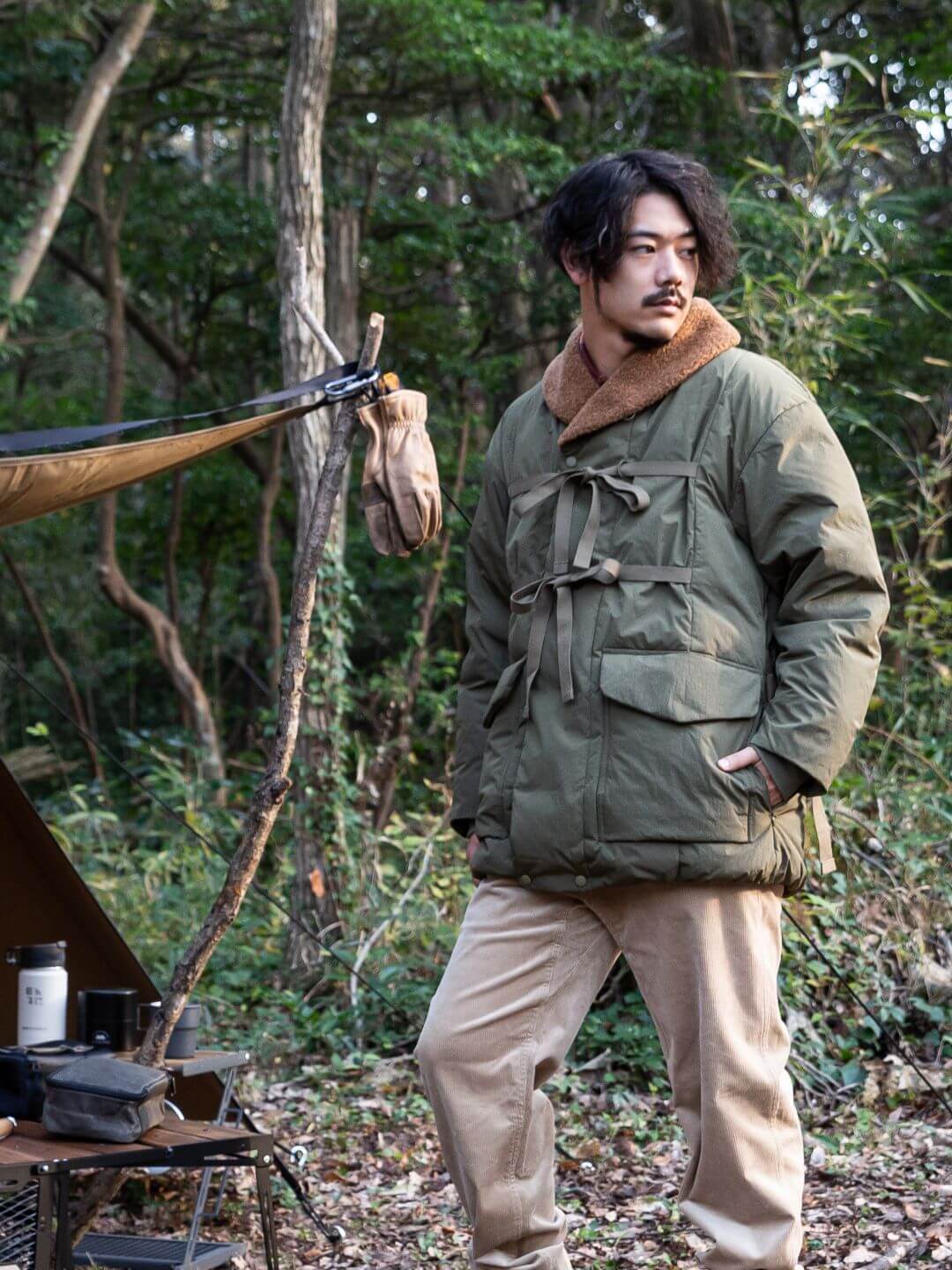 ミリタリーテイストが効いたカラーと少し長めの丈、デザインと機能性のバランスが良いダウンジャケット。