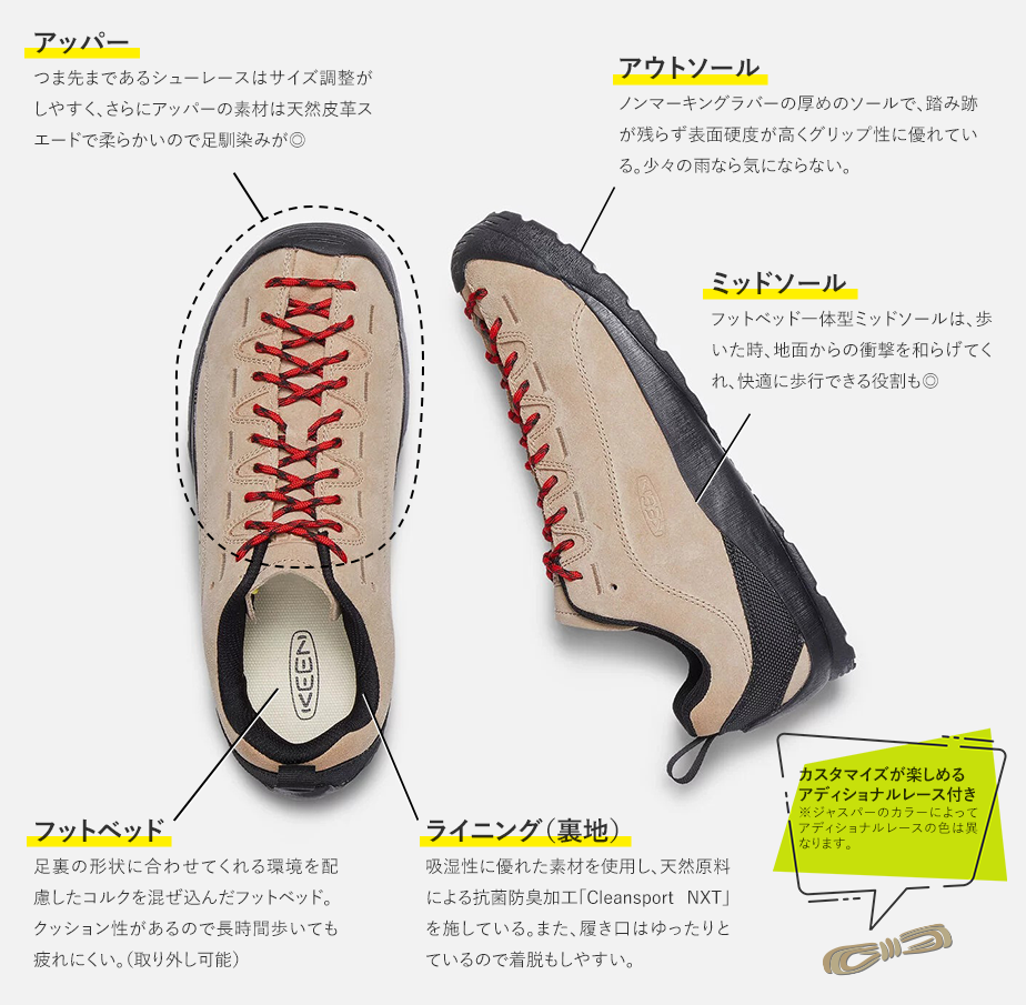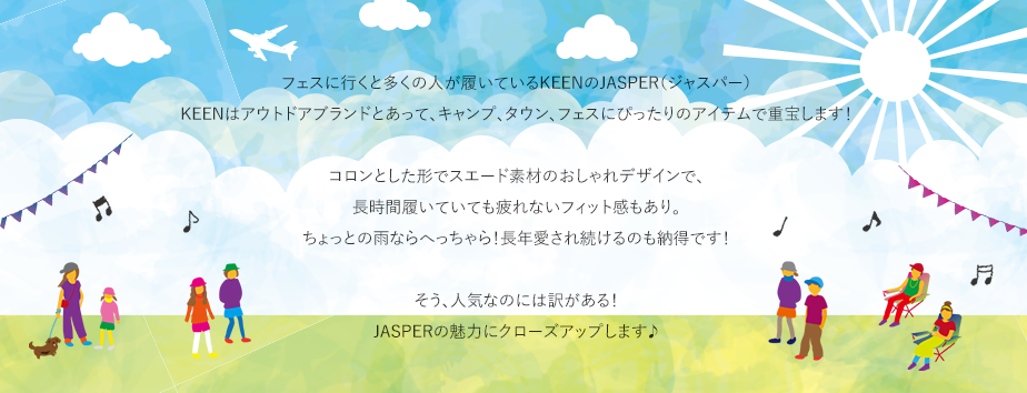 ジャスパーの見た目の独特なフォルムと、他にはない配色と履き心地で、常にアウトドア気分♪