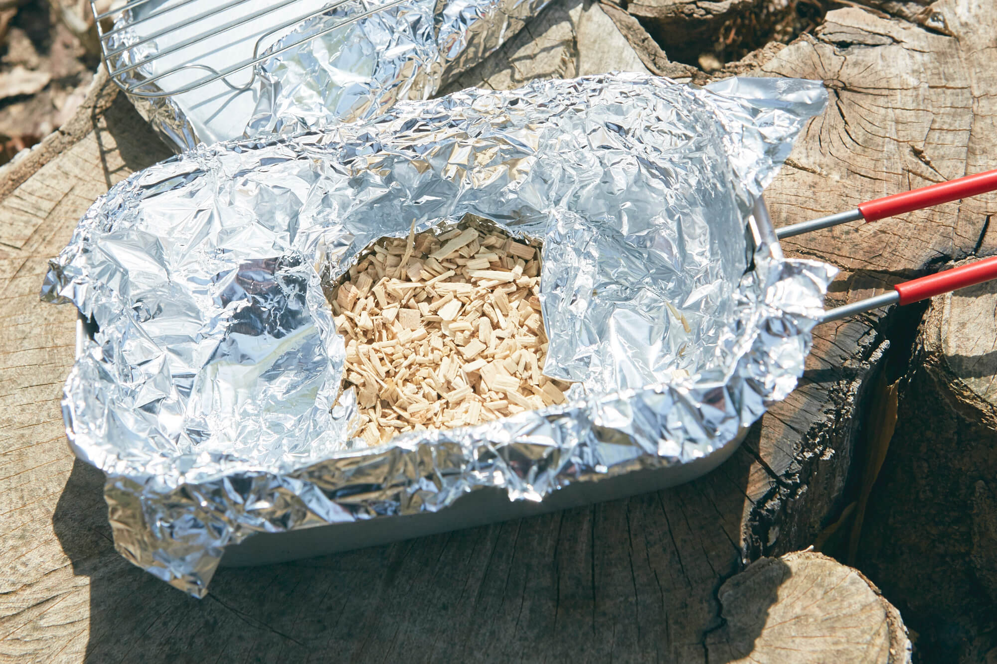 スモークチップにはさくらやりんごなど、使う食材に合った様々な樹種のチップが販売されています。今回はクセの無い香りで間違いのない「ブレンド」のフレーバーを使いました。
