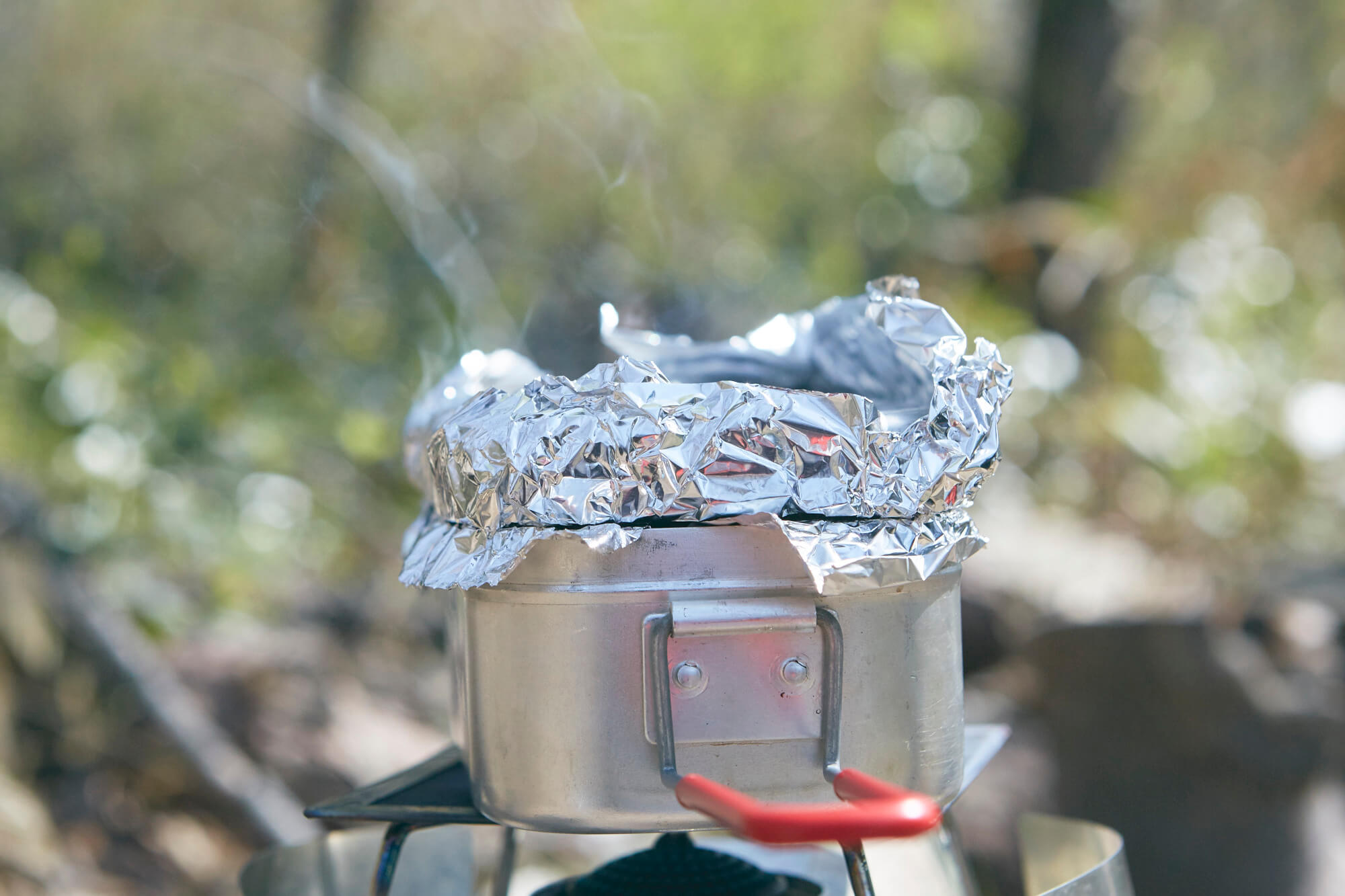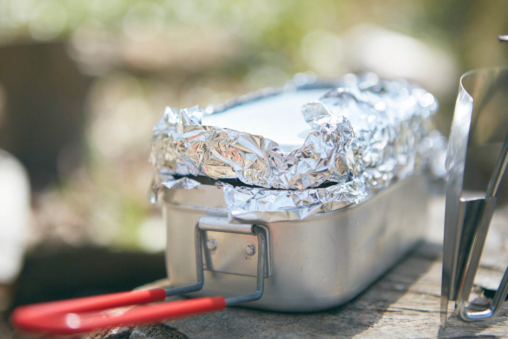 メスティンが茶色く汚れるのを防ぐため、本体と蓋をそれぞれアルミホイルで覆います。更にアルミホイルで軽く器の形を作り、そこにスモークチップを入れました。