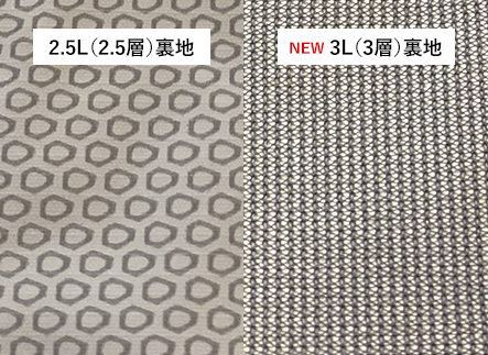 - 3L(3層)になったことで、どういうメリットがあるの?と思われる方も多いはず。表地は、新しいトレントシェルは以前の物より生地がしっかりした感じになっていて、防水・防風性が強化されたように思います。裏地を今までのものと比べてみると、見た目(模様)が違います。3層は模様がすごく細かくなっているのが分かります。2.5層はコーティングなのでビニールのようなツルンとした感じで、3層の方はメッシュが細かい素材が付いたのでサラッとした肌触りになっていました。