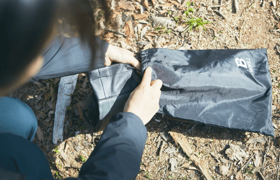 柔らかいのでクルクル丸めて専用の収納袋に。コンパクトにできて持ち運びがしやすい上に、お値段がお手頃なのも人気の一つです!実際にサンデーマウンテンスタッフは、かさ張らないので他のキャンプ道具とともに車に常備しているとのこと。