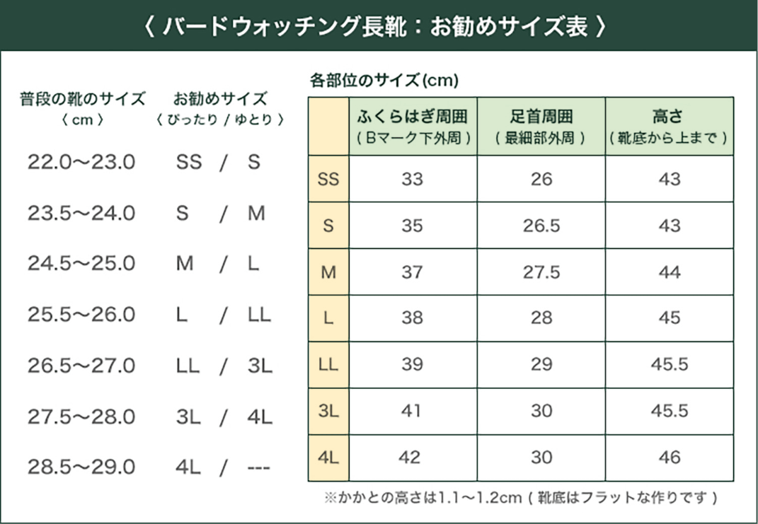 柔らかさ&収納力があるのですが、そのためソールはやや薄めの作りになっています。またバードウォッチングなどで簡単に脱げないよう、ややタイトな設計になっています。 購入するときは、サイズ表を参考にしつつ用途によってお選び頂ければと思います!